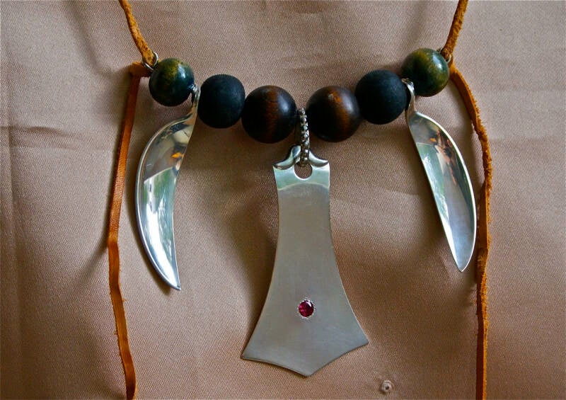 Andy Wall valmistaa myös koruja. Kuvissa ovat asiakkaan tilaamat hopeisista aterimista valmistetut riipus, korvakorut sekä sormus timanttiupotuksin.